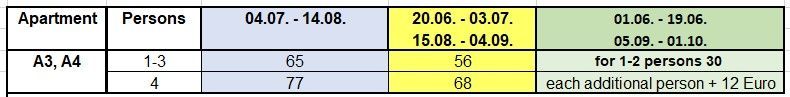 Das Apartment liegt im ersten Geschoss und ist für max. 4 Personen ausgestattet. Für die Apartments 1, 3 und 4 gibt es einen separaten Eingang. Die Gesamtwohnfläche beträgt 37m². Es ist aufgeteilt in 3 Zimmer. Das Wohnzimmer (7,6 m²) verfügt über einen Tisch mit Stühlen, Fernseher und der Kochnische. Diese hat einen Kühlschrank inkl. Gefriertruhe, 2 Gas- und 2 Stromkochplatten, sowie einen Backofen. Die Schlafzimmer sind jeweils 9 m² und sind mit einem Doppelbett, Spiegel und Schränken ausgestattet. Das Bad hat Dusche und WC. Über beide Schlafzimmer gelangt man auf den Balkon zur Meerseite mit Meerblick. Hier befinden sich ein Tisch, Stühle und eine kleine Wäscheleine. Das Apartment verfügt über eine Klimaanlage, die für 7 Euro am Tag hinzugebucht werden kann.