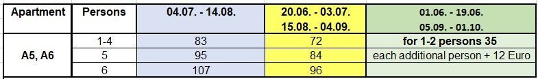 Das Apartment liegt im zweiten Stock und ist für max. 6 Personen ausgestattet. Für die Apartments 5, 6 und 7 gibt es einen separaten Eingang. Die Gesamtwohnfläche beträgt 51m². Es ist aufgeteilt in 3 Zimmer. Das Wohnzimmer (11m²) ist mit einer Schlafcouch, Tisch und Stühlen, Spiegelschrank, einem Fernseher und eine Kochzeile ausgestattet. Diese hat einen Kühlschrank inkl. Gefriertruhe, 4 Stromkochplatten, sowie einen Backofen. Die beiden Schlafzimmer (je 10m²) verfügen über je ein Doppelbett und Schrank. Das Bad hat Dusche und WC. Über beide Schlafzimmer gelangt man auf den Balkon zur Meerseite mit Meerblick. Hier befinden sich ein Tisch, Stühle und eine kleine Wäscheleine. Vom Wohnzimmer aus gelangt man auf einen weiteren kleinen Balkon, der ebenfalls Meerblick hat. Das Apartment verfügt über eine Klimaanlage, die für 7 Euro am Tag hinzugebucht werden kann.