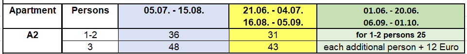 Apartmán se nachází v přízemí a je vybaven maximálně pro 3 osoby. Celková obytná plocha je 20 m²; je rozdělena na 2 místnosti: obývací pokoj o rozloze 9 m², ložnici o rozloze 7,5 m² a koupelnu o rozloze 2,5 m². Nemá balkon. Ložnice je vybavena manželskou postelí, zatímco v obývacím pokoji je rozkládací pohovka, satelitní TV, stůl a židle a kuchyňský kout s lednicí a mrazákem, 2 plynovými a 2 elektrickými plotýnkami a troubou. V koupelně je sprchový kout a toaleta.