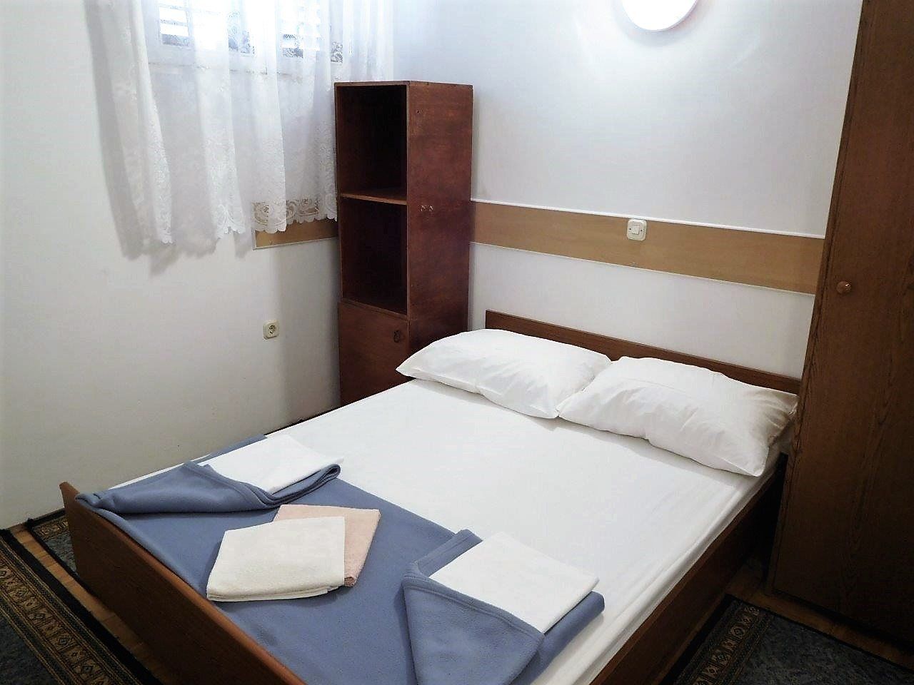 Located on the ground floor, it is equipped for a maximum of 3 people. The total living space is 20m²; it is divided into 2 rooms: a 9m² living room, a 7.5m² bedroom, and a 2.5m² bathroom. It does not have a balcony. The bedroom is furnished with a double bed, while the living room has a sofa bed, satellite TV, a table and chairs, and a kitchenette with a refrigerator and freezer, 2 gas and 2 electric hotplates, and an oven. The bathroom has a shower and toilet. The apartment has air conditioning, which can be booked separately (€5 per day).