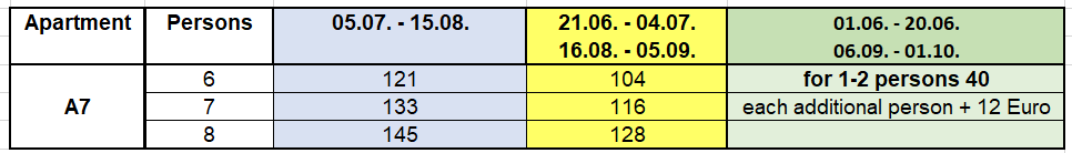 Apartman se nalazi na prvom katu i opremljen je za maksimalno 8 osoba. Apartmani 5, 6 i 7 imaju zaseban ulaz. Ukupna stambena površina je 95 m². Podijeljen je u 4 sobe. Dnevni boravak (20 m²) ima bračni krevet, kauč, stolić za kavu i TV zid. Kuhinja ima kauč na razvlačenje, stol i stolice, a tu je i ostava. Kuhinja je opremljena hladnjakom sa zamrzivačem, 2 plinske i 2 električne ploče za kuhanje te pećnicom. Kuhinja se može odvojiti od dnevnog boravka kliznim vratima i ima zaseban ulaz. Dvije spavaće sobe (svaka od 11 m²) imaju bračni krevet i ormar. Jedna kupaonica ima tuš i WC, a druga kupaonica kadu i WC. Prostrani hodnik također ima kauč i ormar. Obje spavaće sobe i dnevni boravak vode na balkon okrenut prema moru s pogledom na more. Tu su stolovi, stolice i mala vješalica za rublje. Dnevni boravak vodi na još jedan mali balkon, koji također ima pogled na more. Apartman ima dva klima uređaja, koje se mogu rezervirati za 12 eura po danu.
