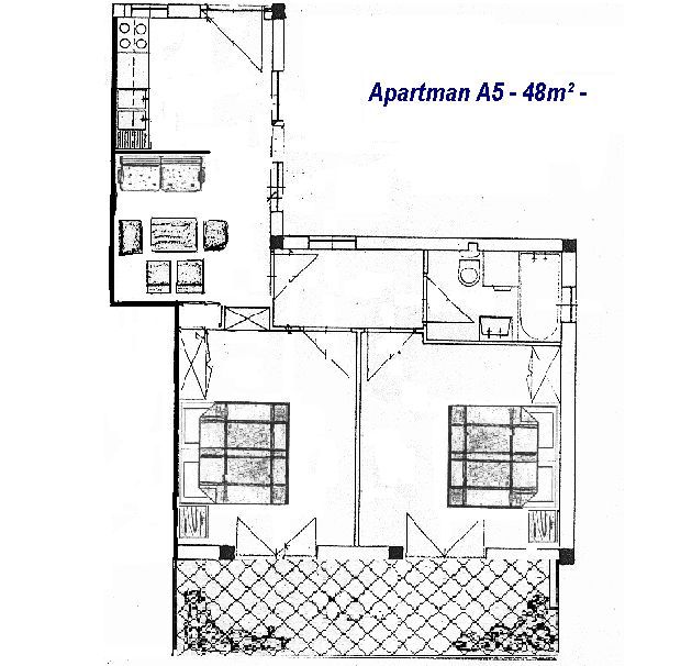 Smješten na drugom katu, opremljen je za maksimalno 5 osoba. Ukupna površina je 48 m²; podijeljen je u 3-4 sobe: dnevni boravak od 6,5 m², 2 spavaće sobe (svaka od 10 m²), kuhinju od 4,7 m² i kupaonicu od 3,5 m². Također ima privatni balkon s pogledom na more. Spavaće sobe opremljene su bračnim krevetom; dnevni boravak ima kauč na razvlačenje, satelitsku TV, stol i stolice; kuhinja je opremljena hladnjakom sa zamrzivačem, 4 električne ploče za kuhanje i pećnicom. Kupaonica ima kadu i WC. Apartman ima klima uređaj koji se može rezervirati zasebno (5 € po danu).