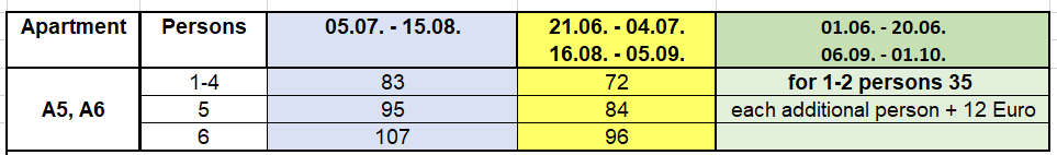 Az apartman a második emeleten található, és maximum 6 fő befogadására alkalmas. Az 5., 6. és 7. számú apartmanok külön bejárattal rendelkeznek. A teljes lakóterület 51m². 3 szobára oszlik. A nappaliban (11m²) kanapéágy, asztal székekkel, tükrös szekrény, TV és konyhasarok található. Ez magában foglal egy hűtőszekrényt fagyasztóval, 4 elektromos főzőlapot és egy sütőt. A két hálószobában (egyenként 10m²) egy-egy franciaágy és egy szekrény található. A fürdőszobában zuhanyzó és WC található. Mindkét hálószobából ki lehet jutni a tengerre néző erkélyre. Van egy asztal, székek és egy kis ruhaszárító kötél. A nappaliból egy másik kis erkélyre lehet kijutni, amely szintén tengerre néző. Az apartmanban légkondicionáló található, amely napi 7 euróért foglalható.