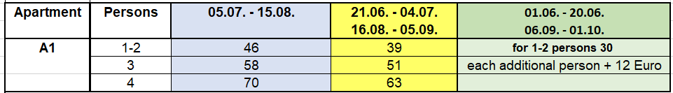 L'appartamento si trova al piano terra ed è attrezzato per un massimo di 4 persone. Gli appartamenti 1, 3 e 4 hanno un ingresso separato.La superficie abitabile totale è di 29 m². È suddivisa in due stanze. Il soggiorno è di 8,5 m² e dispone di un divano letto, una TV, un tavolo con sedie e un angolo cottura. Quest'ultimo è dotato di frigorifero con congelatore, due fornelli a gas e due elettrici, e un forno.Anche la camera da letto misura 8,5 m² ed è arredata con un letto matrimoniale, uno specchio e armadi. Il bagno è di 2,5 m² e dispone di doccia e WC.