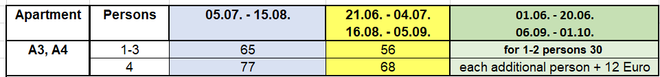 L'appartamento si trova al primo piano ed è attrezzato per un massimo di 4 persone. Gli appartamenti 1, 3 e 4 hanno un ingresso indipendente. La superficie abitabile totale è di 37 m² ed è suddivisa in 3 stanze. Il soggiorno (8,5 m²) dispone di un tavolo con sedie, una TV e un angolo cottura. Quest'ultimo è dotato di frigorifero con congelatore, 2 fornelli a gas e 2 elettrici e un forno. Le camere da letto misurano 9 m² ciascuna e sono arredate con un letto matrimoniale, uno specchio e armadi. Il bagno è dotato di doccia e WC. Entrambe le camere da letto si aprono sul balcone vista mare, attrezzato con tavolo, sedie e un piccolo stendibiancheria. L'appartamento è dotato di aria condizionata, prenotabile al costo di 7 euro al giorno.