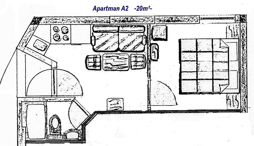 Znajduje się na drugim piętrze i jest przystosowany dla maksymalnie 6 osób. Całkowita powierzchnia mieszkalna wynosi 51 m²; jest podzielony na 3 pokoje: salon o powierzchni 11 m², 2 sypialnie (każda o powierzchni 10 m²) i łazienkę o powierzchni 3,5 m². Posiada dwa prywatne balkony z widokiem na morze. Każda z sypialni jest wyposażona w łóżko podwójne. W salonie znajduje się duża rozkładana sofa, telewizja satelitarna, stół i krzesła oraz aneks kuchenny z lodówką i zamrażarką, 4 elektrycznymi płytami grzewczymi i piekarnikiem. W łazience znajduje się prysznic i toaleta. Klimatyzację można zarezerwować za dodatkową opłatą. Apartament ma klimatyzację, którą można zarezerwować osobno (5 € za dzień).