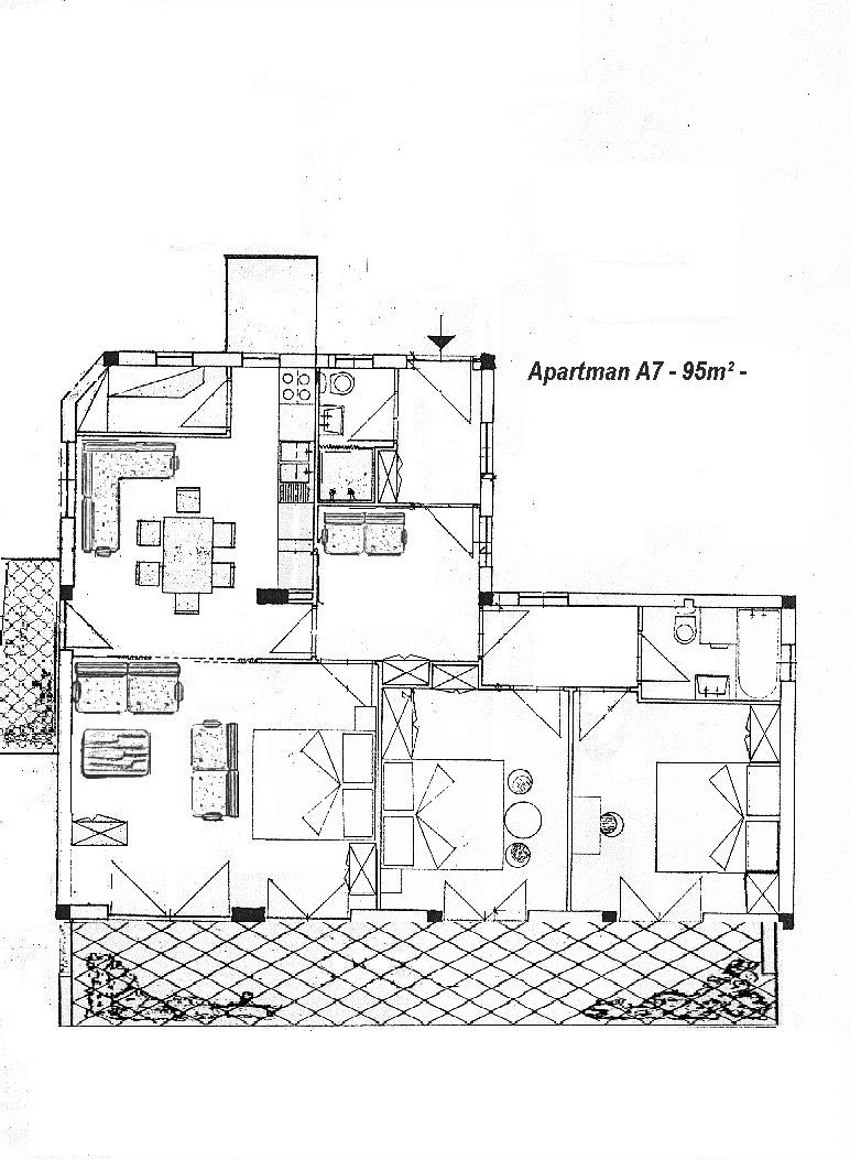 Znajduje się na pierwszym piętrze i jest przystosowany dla maksymalnie 8 osób. Całkowita powierzchnia mieszkalna wynosi 95 m²; jest podzielony na 4 pokoje: salon o powierzchni 20 m², 2 sypialnie (każda o powierzchni 11 m²) i 2 łazienki (każda o powierzchni 3 m²). Posiada trzy prywatne balkony z widokiem na morze. Każda z sypialni jest wyposażona w łóżko podwójne; w salonie znajduje się łóżko podwójne, szafa i narożna sofa z telewizją satelitarną. Kuchnia jest oddzielona od salonu przesuwanymi drzwiami i zawiera stół i krzesła, rozkładaną sofę, lodówkę z zamrażarką, 2 gazowe i 2 elektryczne płyty grzewcze, piekarnik i spiżarnię. Jedna łazienka ma prysznic/WC, druga wannę/WC. Apartament ma dwie jednostki klimatyzacyjne, które można zarezerwować osobno (10 € za dzień).